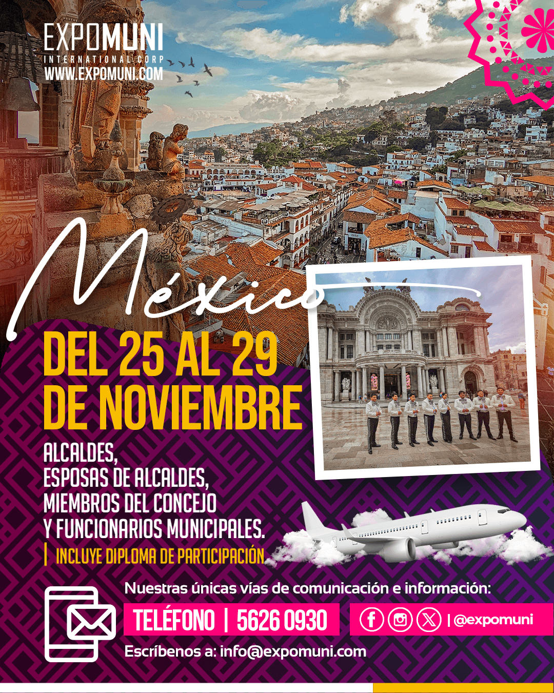 Para los empleados municipales se requiere consentimiento del Alcalde y nombramiento de cargo municipal | Para los participantes que no posean visa mexicana, pueden inscribirse en la EXPOMUNI | Ciudad de México 2025, y deben cumplir con los requisitos que la Embajada Mexicana solicita, ya que de ellos es la decisión de otorgarle la visa mexicana, basada en sus expedientes. Para más información de nuestros viajes puede escribirnos a info@expomuni.com